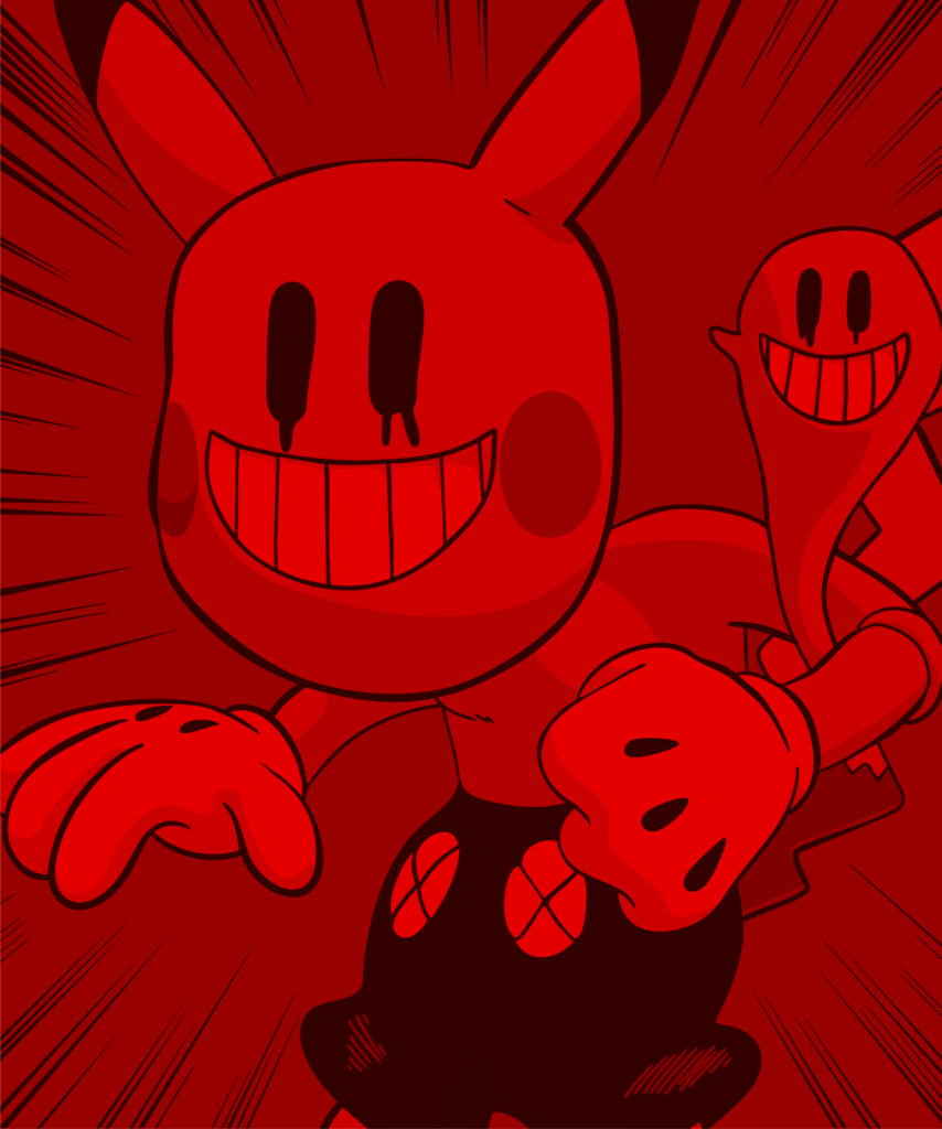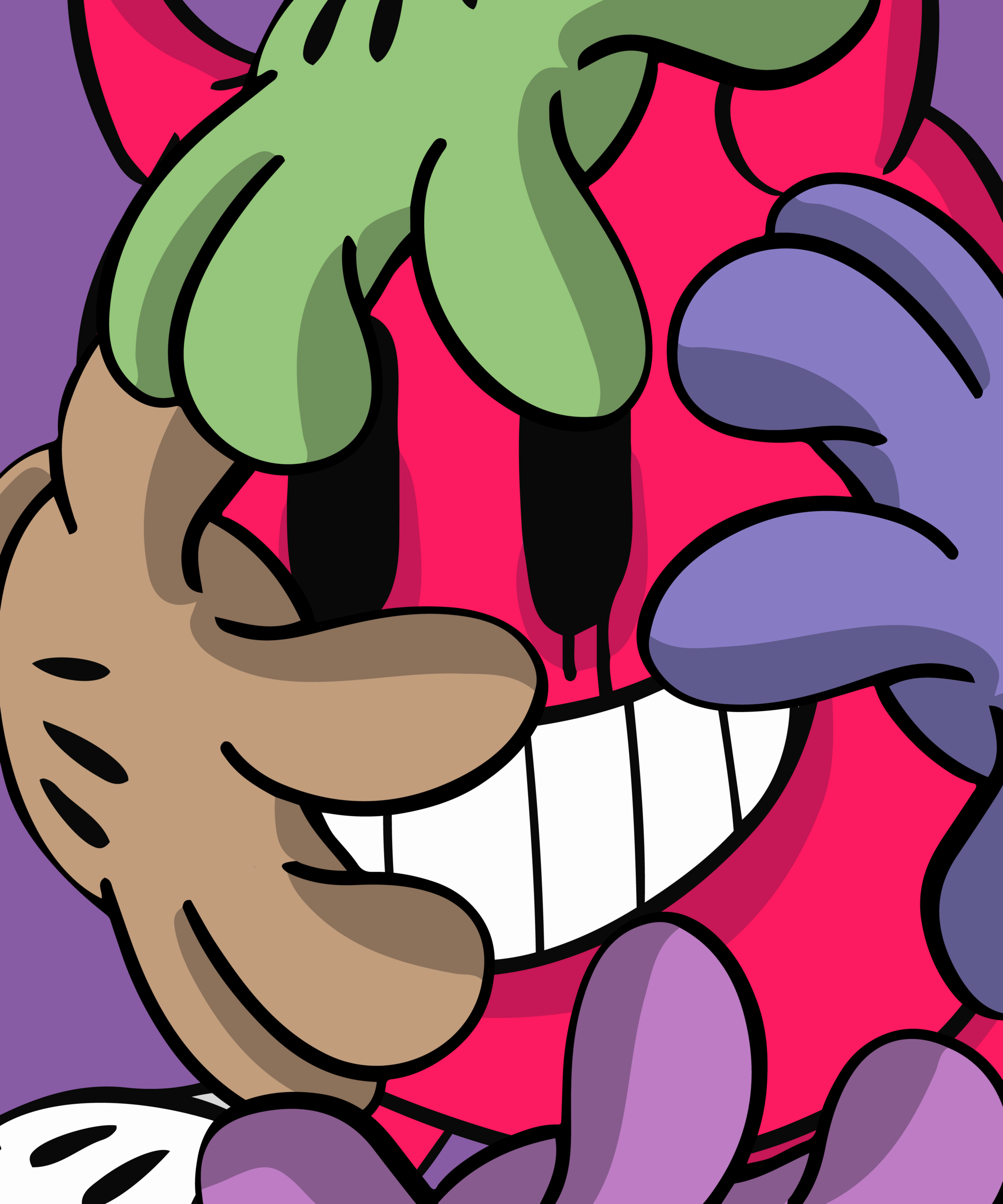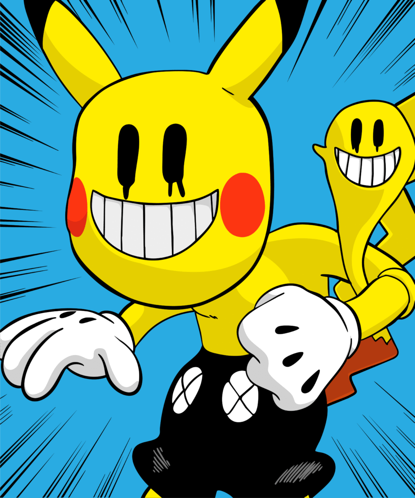 Pop archetypes collide, and innocence turns into parody, a grin carved between nostalgia and chaos.
